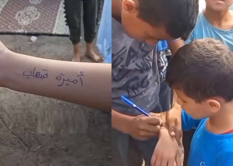 وغرد ناشط خليجي: “أطـفال غزة العظام يكتبون أسماءهم على أيديهم الطاهرة للتعرف عليهم في حالة استشهادهم .. لقد أتعبتونا من بعدكم أيها الأبطال الصغار، الكبار بالأفعال .. نستميحكم العذر في قلة حيلتنا، ولا يسعنا غير الدعاء لكم والدعم المادي والمعنوي قدر استطاعتنا .. لا حول ولا قوة إلا بالله”.