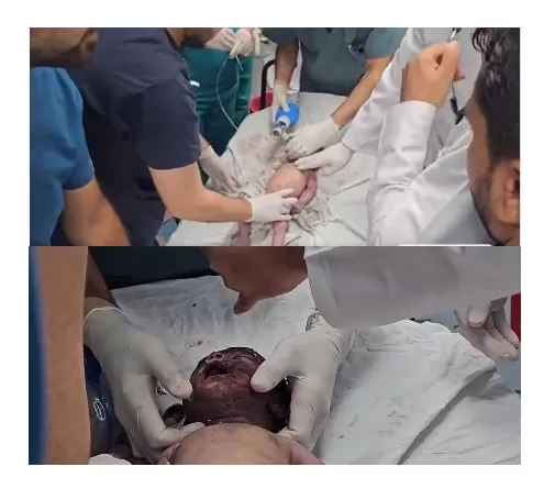 وشوهد عدد كبير من الأطباء وهم يحاولون إنقاذ الرضيع الفلسطيني في أحد المستشفيات، ويبدو أن الرضيع كان قد وُلد قبل بضعة أيام أو أسابيع.