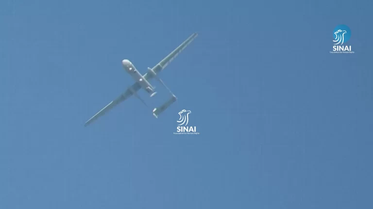 صور خاصة مثبته من مقاطع فيديو حصلت عليها مؤسسة سيناء تظهر تحليق طيران استطلاع فوق قرية المهدية ومحيط معبر كرم أبو سالم بالقرب من موقع حادث سقوط قذيفة اسرائيلية على موقع عسكري مصري جنوب رفح.