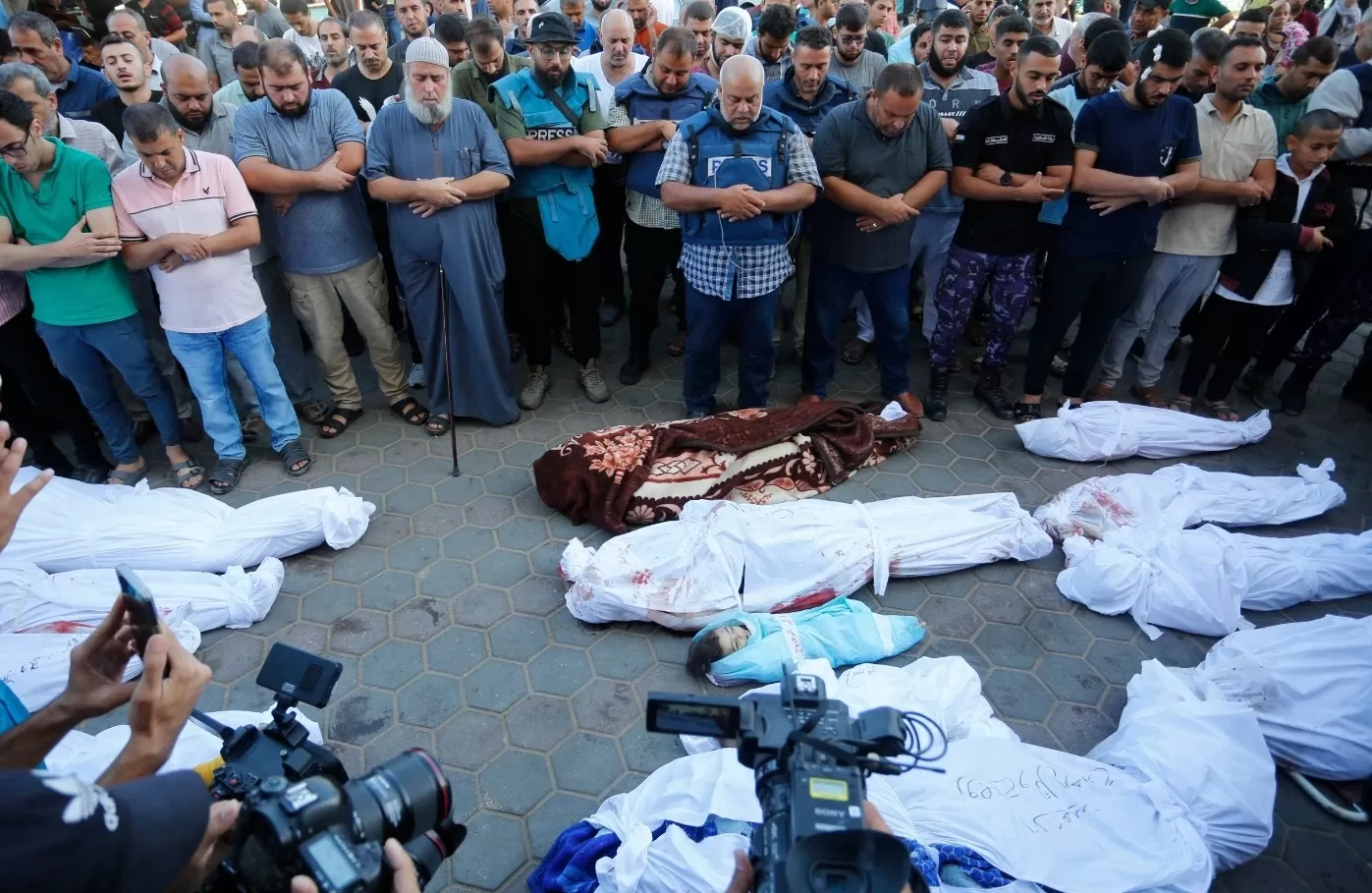 وبثت قناة الجزيرة، لقطات حية من أمام مستشفى شهداء الأقصى في دير البلح، أين أقيمت صلاة جنازة جماعية على أرواح عدد من الشهداء.