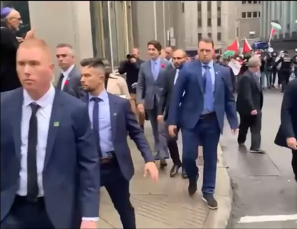 وظهر في الفيديو المتداول على منصات التواصل الاجتماعي مجموعة من النشطاء الكنديين يحملون أعلام فلسطين يلاحقون رئيس الوزراء الكندي الذي كان محاطا بحرسه الشخصي ويتجه نحو سيارته.