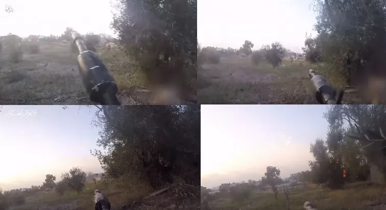 مقاتلو القسام يوجهون أسلحتهم أثناء استهدافهم آلية الاحتلال