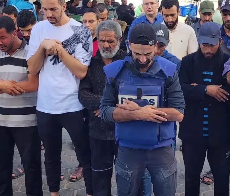 الزميل محمد العالول مصور وكالة أنباء الأناضول يصلي الجنازة على 4 من اطفاله احمد ورهف وكمان وقيس و4 من إخوته عاطف وكمال واحمد وسجود استشهدوا في الغارة الهمجية لجيش الاحتلال الاسرائيلي على مخيم