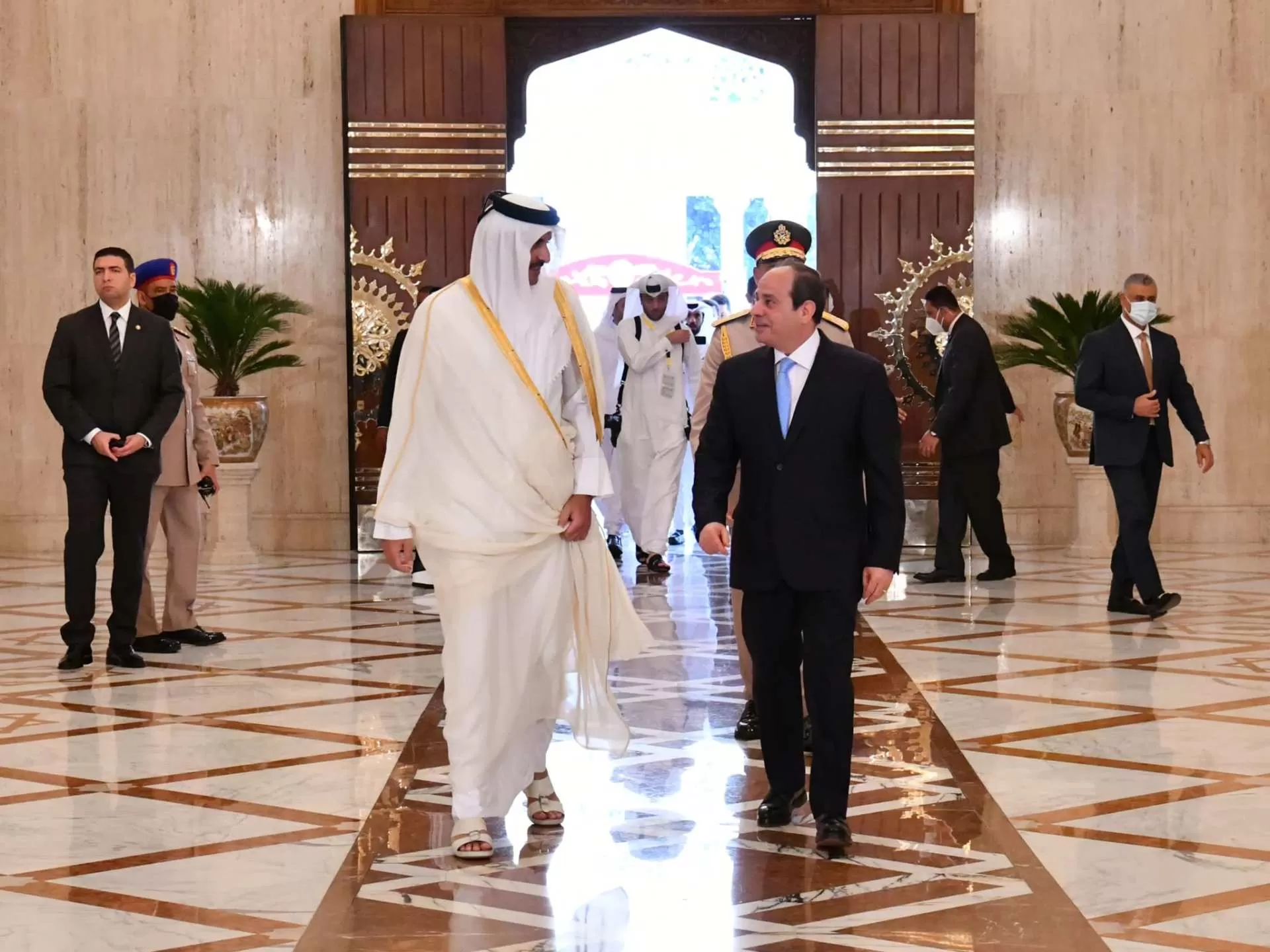 وكان أمير قطر قد وصل إلى العاصمة المصرية صباح، الجمعة، وكان في استقباله لدى وصوله المطار الرئيس عبد الفتاح السيسي، قبل عقد القمة الثنائية بينهما بشأن الوضع في غزة.