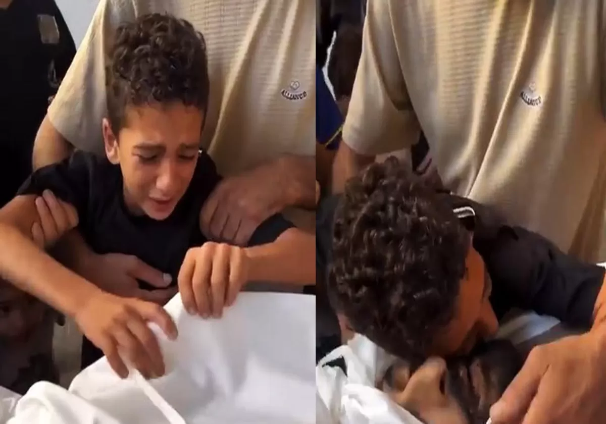 طفل فلسطيني يُودع والده بالدموع بعد اسشتهاده جراء قصف الاحتلال الإسرائيلي المستمر على قطاع غزة
