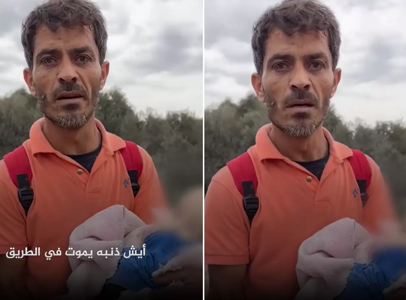 وطن – وثّقت لقطات مصورة توصف بالمأساوية، وفاة رضيع فلسطيني أثناء نزوح عائلته إلى جنوب قطاع غزة.