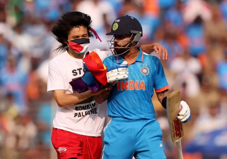 وطن- اقتحم مشجع مباراة نهائي كأس العالم لبطولة الكريكيت، الأحد، بين منتخبي الهند وأستراليا، على ميدان ملعب (ناريندرا مودي) للتضامن مع فلسطين على طريقته الخاصة، إثر الحرب الإسرائيلية على قطاع غزة المستمرة لليوم ل44
