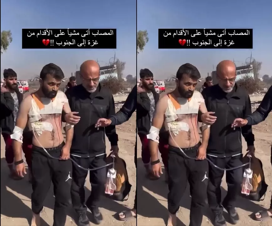 تُظهر هذه اللقطات، جيش الاحتلال الإسرائيلي وقد أجبر أحد الجرحى الفلسطينيين على النزوح سيرا على الأقدام من شمال قطاع غزة إلى جنوبه وهو يحمل جراحه.