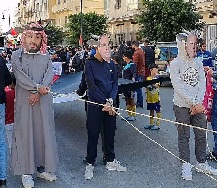 المتظاهرون المغاربة في طنجة من المتضامنين مع غزة عبروا عن رفضهم لسياسات حكام عرب من أمثال محمد بن سلمان والسيسي بأسلوب ساخر