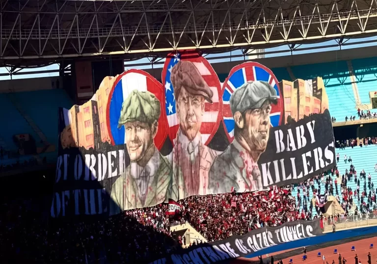 وكتب على التيفو السياسي الذي حمله جماهير نادي الأفريقي التونسي باللغة الإنجليزية مترجم، “بأمر من قتلة الأطفال” مع إرفاق صور رؤساء دول الولايات المتحدة الأمريكية وفرنسا وبريطانيا.