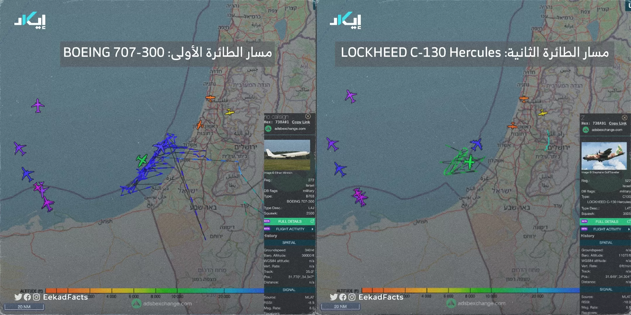 وأظهرت برامج الملاحة تحليق طائرتين الأولى من طراز BOEING 707-300، وبحسب موقع سلاح الجو الإسرائيلي فإن هذه الطائرة، هي طائرة تزويد وقود.