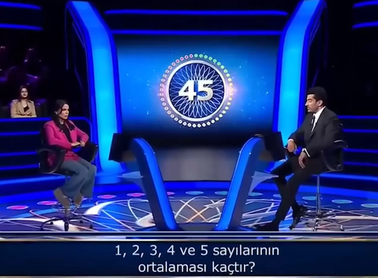 وكان السؤال باللغة التركية لمتسابقة تركية عن ما هو متوسط الأعداد 1، 2، 3، 4، 5 مع خيارات 3 و 9 و 6 و15.