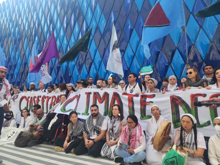وعلى هامش اليوم الرابع لمؤتمر الأمم المتحدة للمناخ (كوب 28) المنعقد في دبي تجمّع نشطاء ومن بينهم فلسطينيون، بالقرب من الجناح المخصص للاحتلال الإسرائيلي في المؤتمر.
