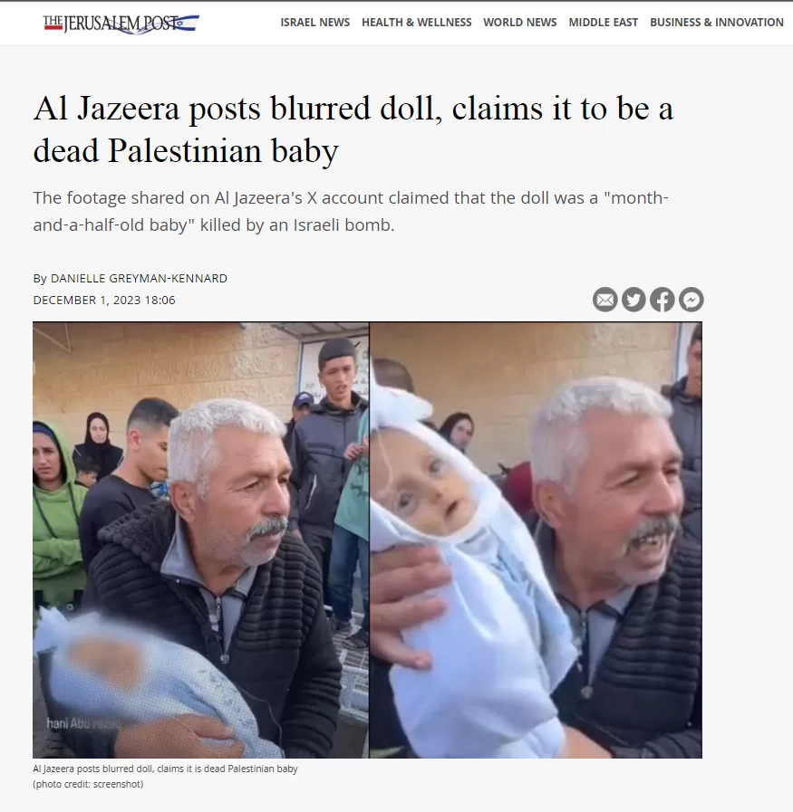 ووجهت القناة العبرية، اتهاما لقناة الجزيرة بنشرها لقطات لرجل يحمل “دمية”.