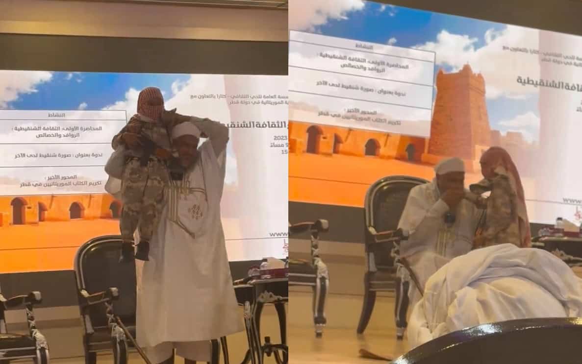 وظهر الطفل وهو يقترب من الددو الذي بدا يرحب به بحفاوة، ثم يرفعه عاليا ويضعه على كتفه الأيسر وسط تصفيق حاد من الحضور قبل أن يأتي شخص ويأخذ الطفل.