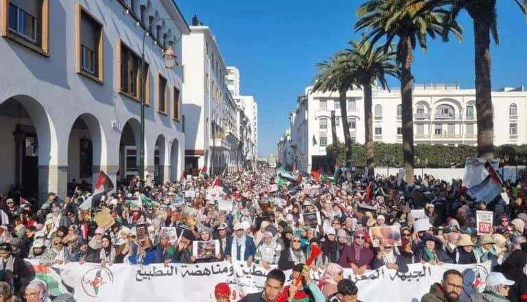 وسار أكثر من عشرة آلاف متظاهر في شارع محمد الخامس في وسط العاصمة تحت شعار “أوقفوا حرب الإبادة على غزة.. أوقفوا تطبيع الدولة المغربية مع الكيان الصهيوني”، وذلك بدعوة من الجبهة المغربية لدعم فلسطين ومناهضة التطبيع.