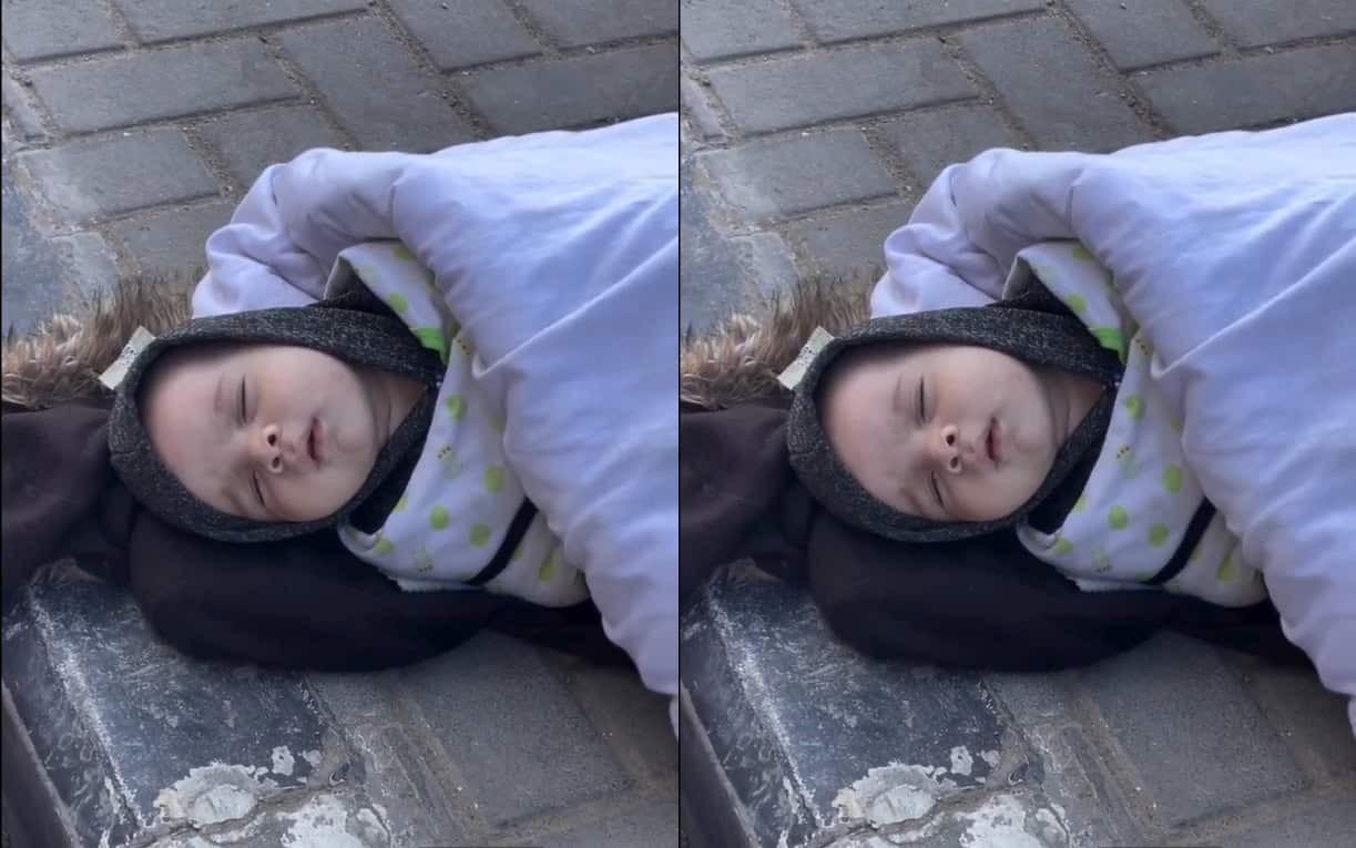 وأظهرت لقطات مصورة، واقعة مؤلمة في غزة، حيث شوهد طفل رضيع وهو ينام على أحد الأرصفة بمخيم البريج في غزة.