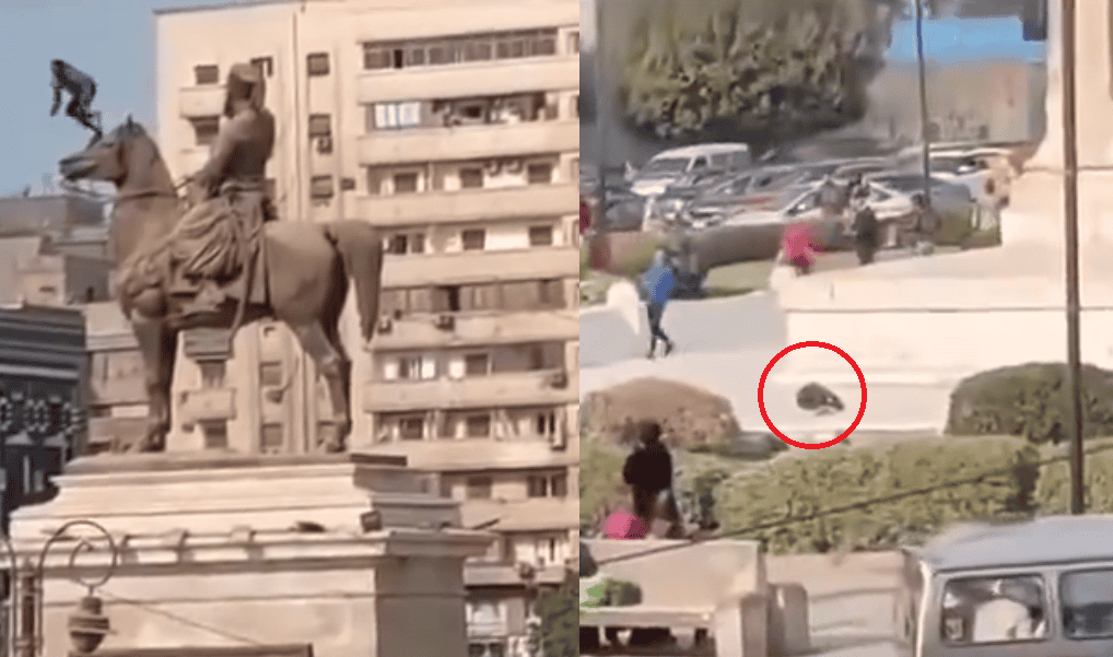 وأظهرت اللقطات لحظة قفز الشاب من أعلى التمثال محاولاً الانتحار وسط ذهول وصدمة من كانوا متواجدين بمكان الحادثة التي جرت تحديداً بجوار مترو العتبة في حي العتبة وسط العاصمة المصرية.