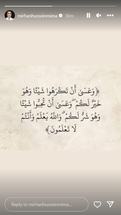 كما نشرت ميرهان عبر ستوري حسابها في انستغرام آية من القرآن: “وعسى أن تكرهوا شيئا وهو خير لكم وعسى أن تحبوا شيئا وهو شر لكم والله يعلم وأنتم لا تعلمون”. الأمر الذي أثار تساؤلاتٍ جدية وحقيقية من الجمهور عن مغزى نشرها لهذه الآية بالذات مع انتشار تلك الأنباء عنها .