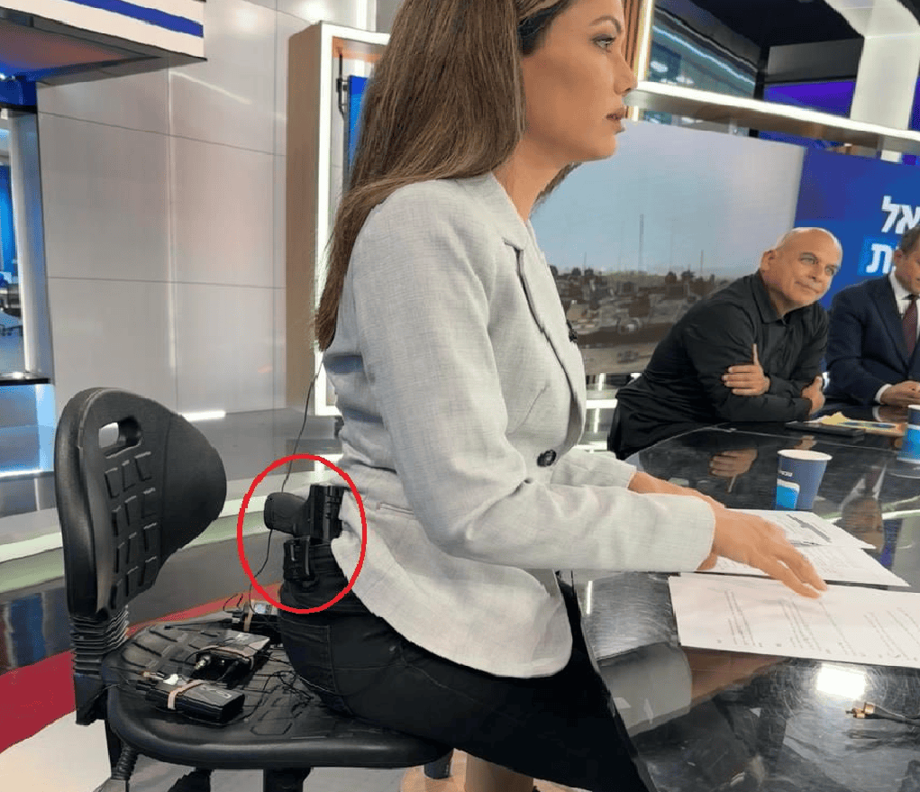 الصحفية الإسرائيلية، ليتال شيمش تقدم برنامجا على القناة 14 الإسرائيلية، تظهر حاملة مسدس خلال البث الحيّ..