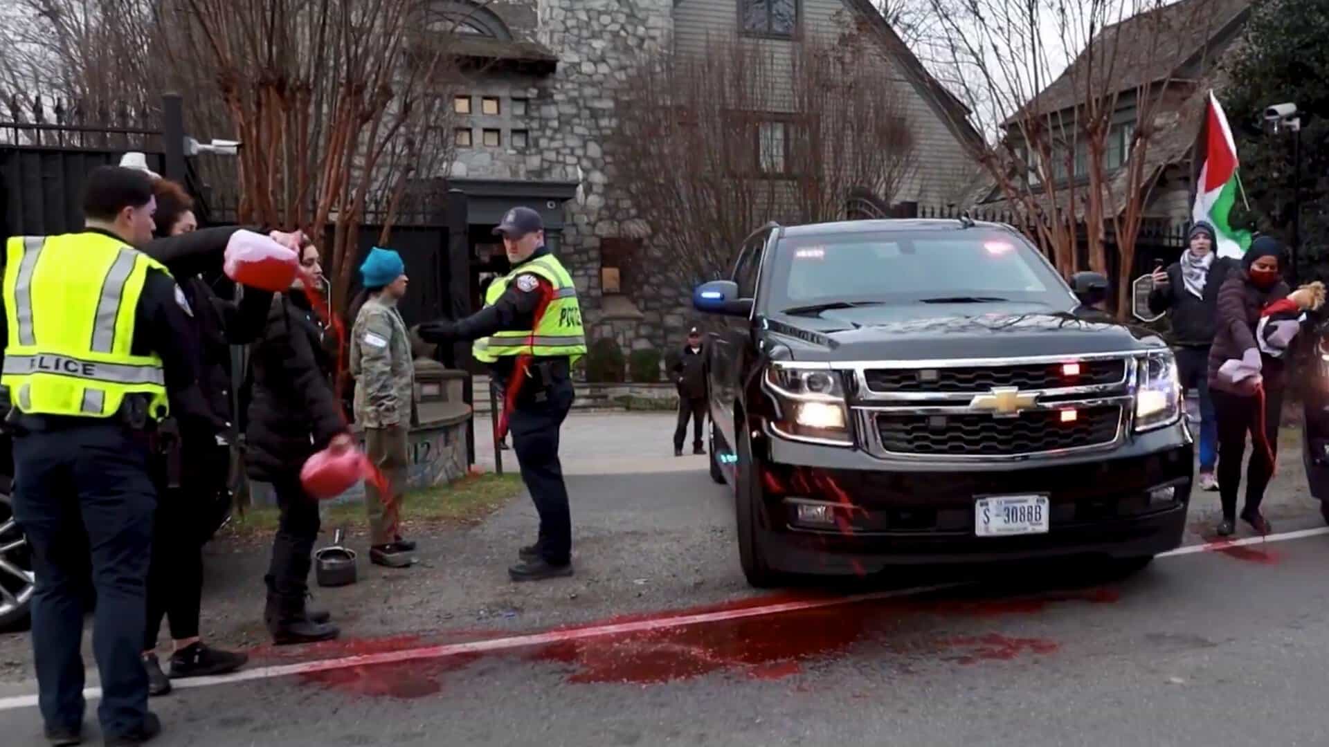 وطن – في مشهد تضامني مع الفلسطينيين، أقدم نشطاء في الولايات المتحدة على إلقاء طلاء أحمر على السيارة الرسمية لوزير الخارجية الأمريكي أنتوني بلينكن أثناء مغادرته منزله في ولاية فرجينيا.