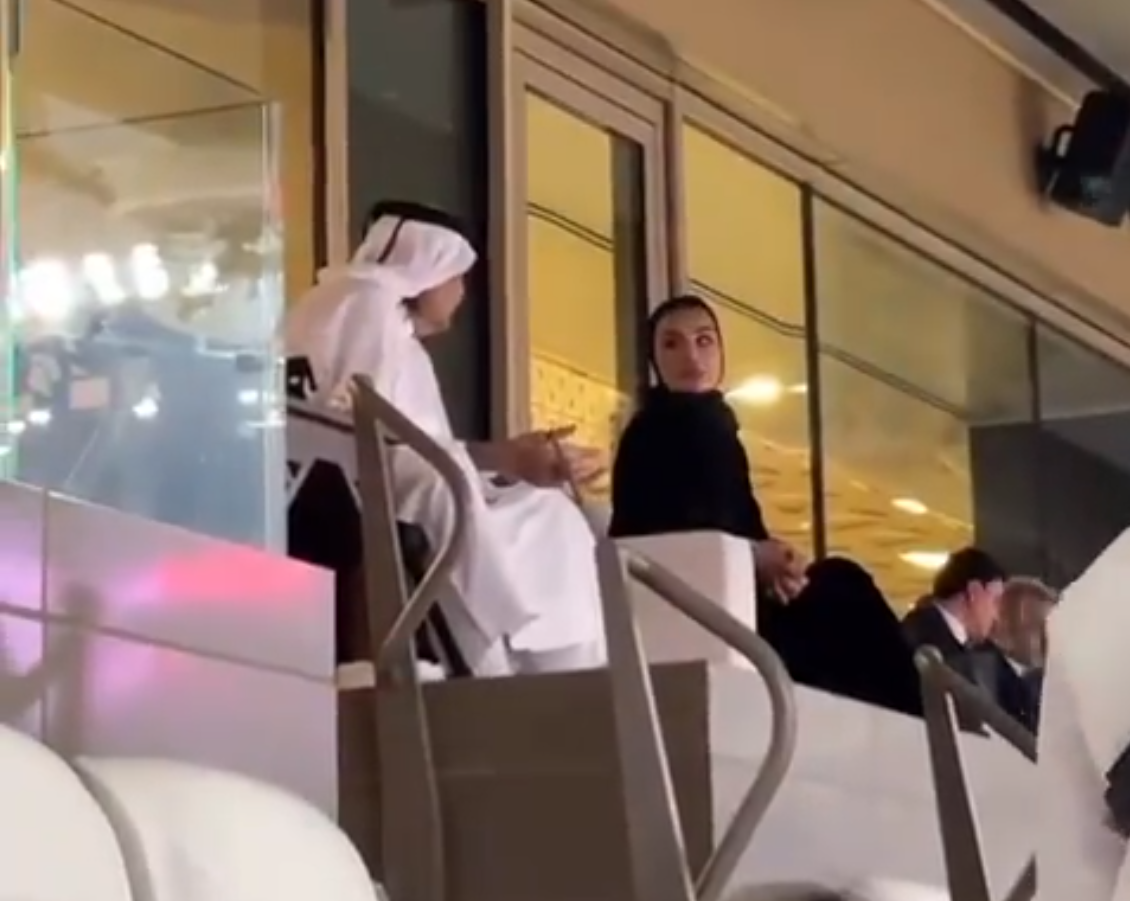 وظهر الشيخ حمد بن خليفة “الأمير الوالد”- كما يلقبه القطريون- وزوجته الشيخة موزا وهما يتبادلان الحديث ويتابعان المباراة.
