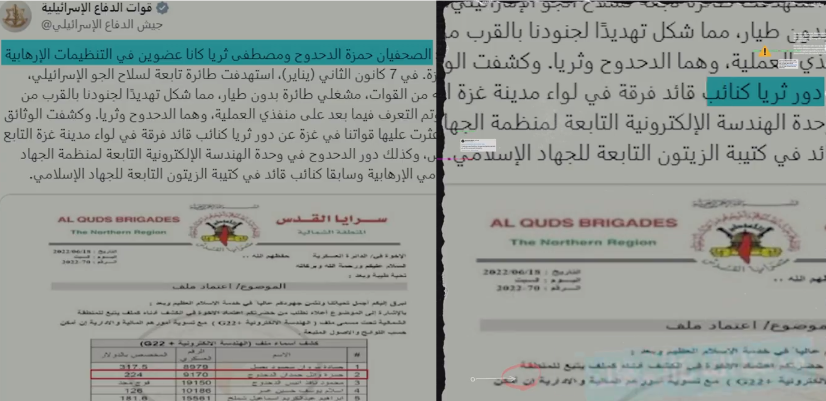 ونشر جيش الاحتلال الوثيقة مدعياً أنها تعود لـ”سرايا القدس” وذكر فيها اسم الصحفي “حمزة الدحدوح” على أنه عضو في المجموعة.