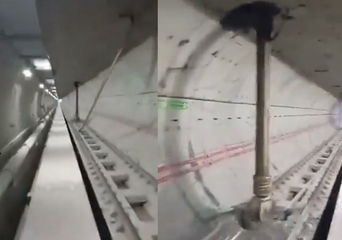 وتبين من الفيديو أنّ الحفر اخترق سقف النفق ووصل إلى قضبان المترو.
