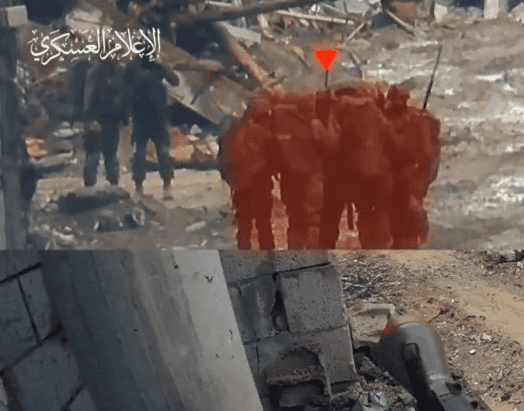وظهر مقاتل قسامي داخل منزل قيد الإنشاء وهو يسدد قذيفة الياسين 105 نحو جنود إسرائيليين.