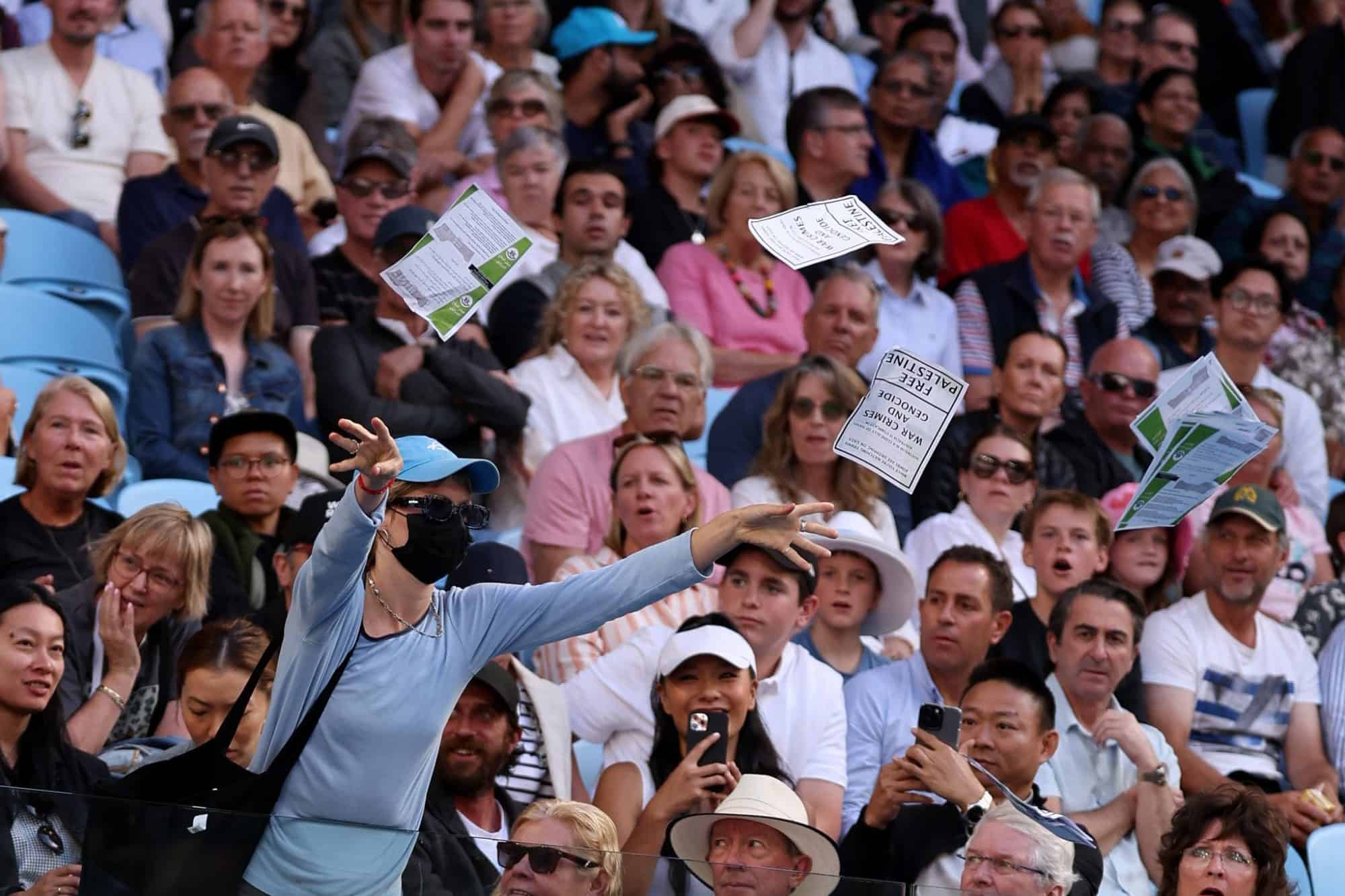 إلقاء إحدى الناشطات المؤيدات لفلسطين منشورات داعمة للقضية في بطولة أستراليا للتنس المفتوح