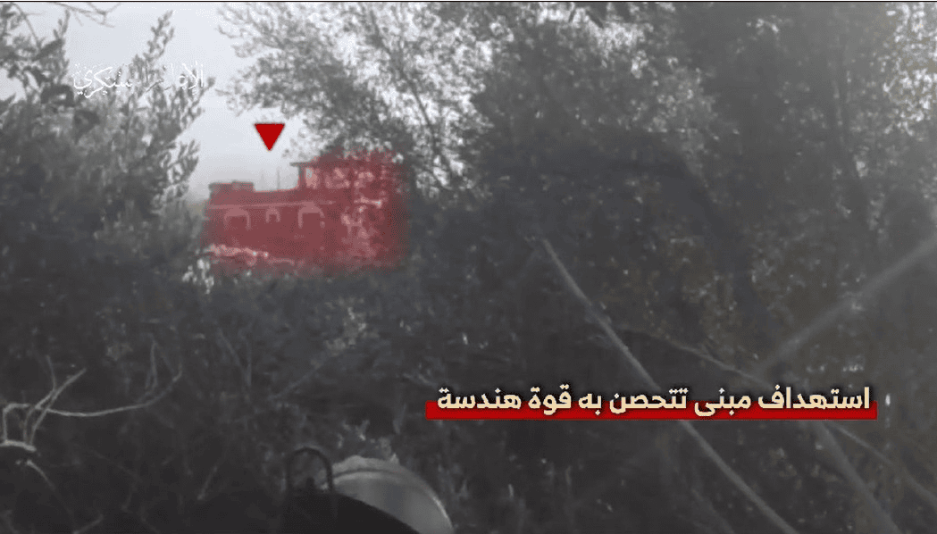 وأظهر أحد المشاهد مقاوماً خلف أحراش كثيفة وبدا مبنى تتحصن به قوة هندسية إسرائيلية.