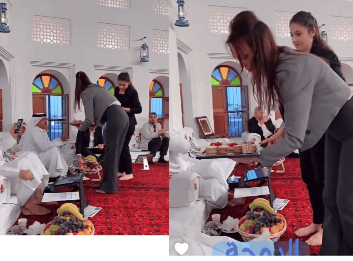 وأظهر مقطع فيديو الفتاتين وهما تقدمان الضيافة للحضور الذين بدوا جالسين على الأرض، فيما لوحظ بعضهم وهو يرفعون جوالاتهم لالتقاط مقاطع فيديو لهما.