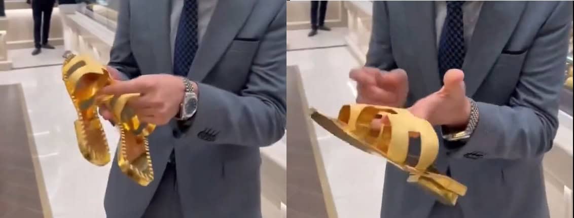وظهر في الفيديو أحد العاملين في المحل وهو يستعرض نعلا ذهبيا وزنه 1 كلغ ونصف من الذهب الإيطالي وسعره 163 مليون دينار عراقي أي حوالي 125 ألف دولار أمريكي.