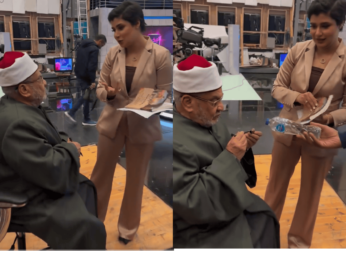 وظهر الداعية المصري الذي يعلن دعمه للنظام في كواليس الحلقة، وأمامه مذيعة “برنامج البخت” على قناة “الشمس” خلود عزمي، وهي تطلب من كريمة كتابة إهداء لها على كتاب فلسطين عربية.