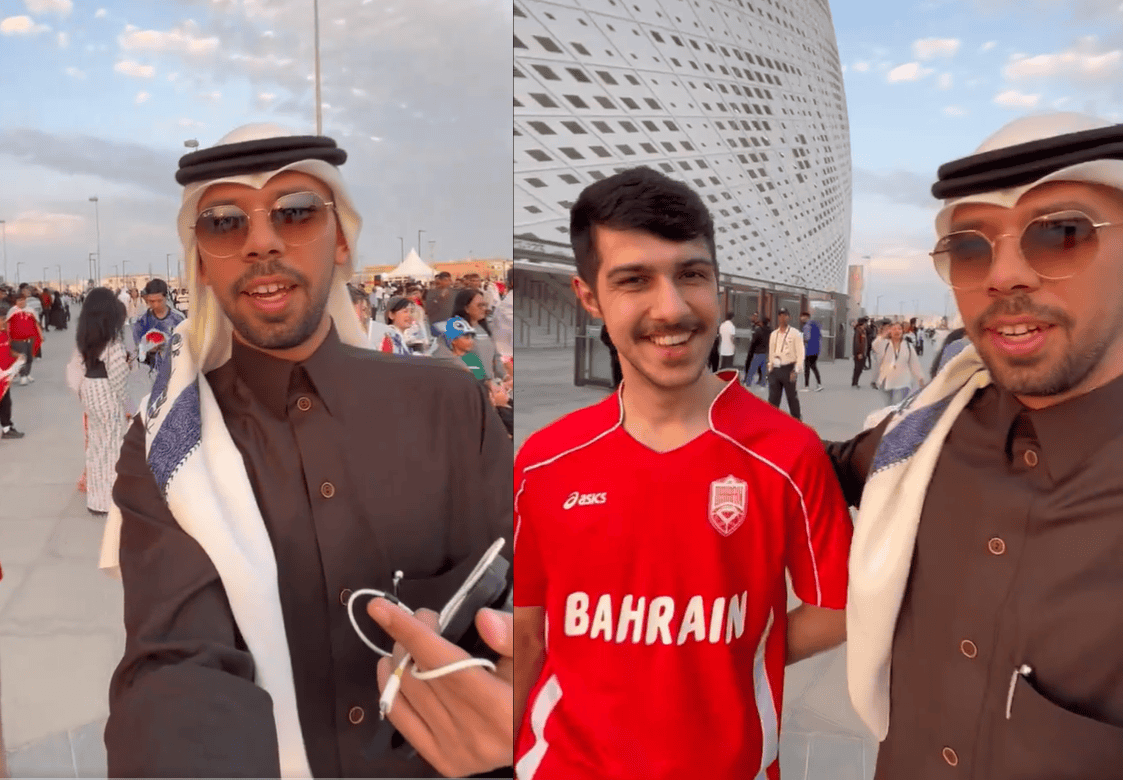 وظهر خالد بمقطع آخر وهو يتحدث لمجموعة مشجعين بحرينيين مخاطباً إياهم: “احنا قلنا الأمل فيكم” ليردوا عليه: “سيناريو متوقع.. لبسونا العقال”.