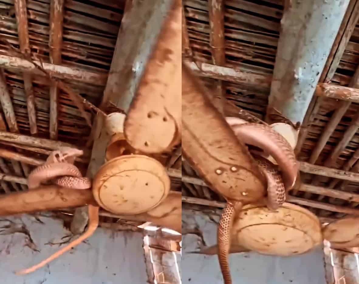 وطن – غزا مقطع فيديو، منصات التواصل الإجتماعي، ويظهر أفعى كوبرا الملك مُعلقة على مروحة السقف، ما ترك مشاهدي المقطع في حالة ذهول.