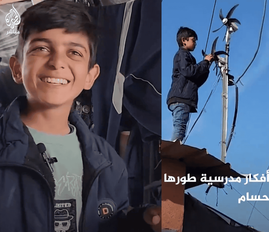وقالت قناة “الجزيرة مباشر” في تقرير مصور لها إن الطفل “حسام العطار” نجح باختراع يولد التيار الكهربائي داخل خيمة نزوحه.