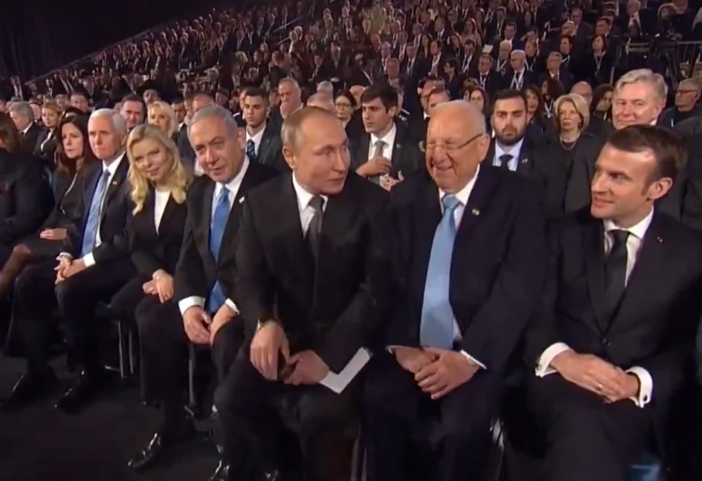 ويظهر في المقطع المتداول، فلاديمير بوتين وهو يدخل إلى قاعة مؤتمر ذكرى ما يسمى “الهولوكوست 75″، حيث قام بالتسليم على الرئيس الفرنسي إيمانويل ماكرون، وملك بريطانيا تشارلز الثالث، قبل أنّ يجلس على مقعده المخصص بجانب نتنياهو مباشرة.