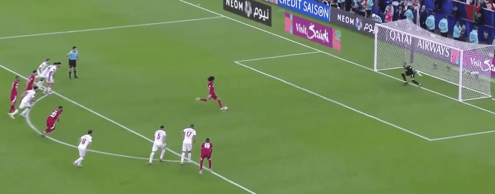 وحقق هنا اللاعب القطري كل الشروط المحققة للتسجيل، بحسب خبير التحكيم جمال الشريف الذي أكد أن قرار الحكم كان صحيحا هنا، لأن أكرم عفيف لم يكن في حالة تسلل.