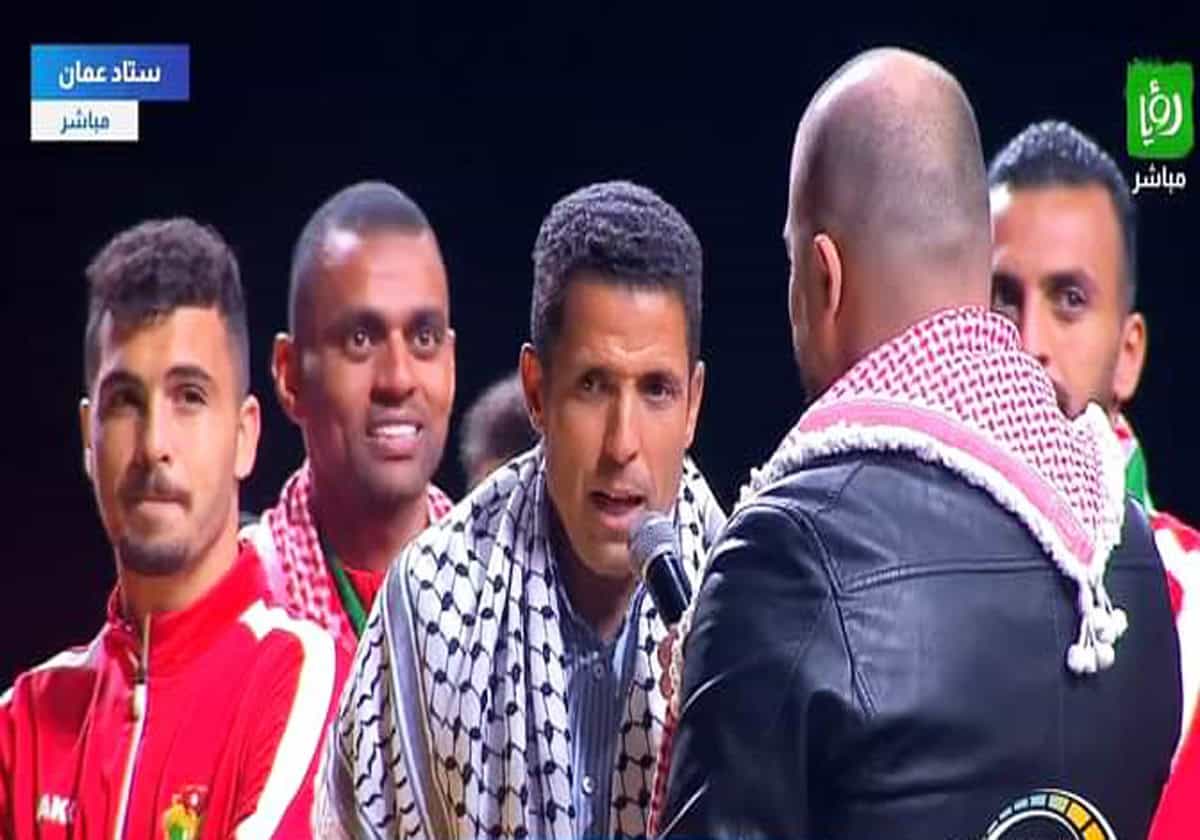 وطن- ارتدى مدرب نشامى الأردن الحسين عموتة الكوفية الفلسطينية خلال الاستقبال الحافل لنجوم المنتخب من قبل الجماهير داخل ملعب (استاد عمان) الدولي، بعد الإنجاز التاريخي الذي حققه النشامى في بطولة كأس آسيا 2023 قطر.