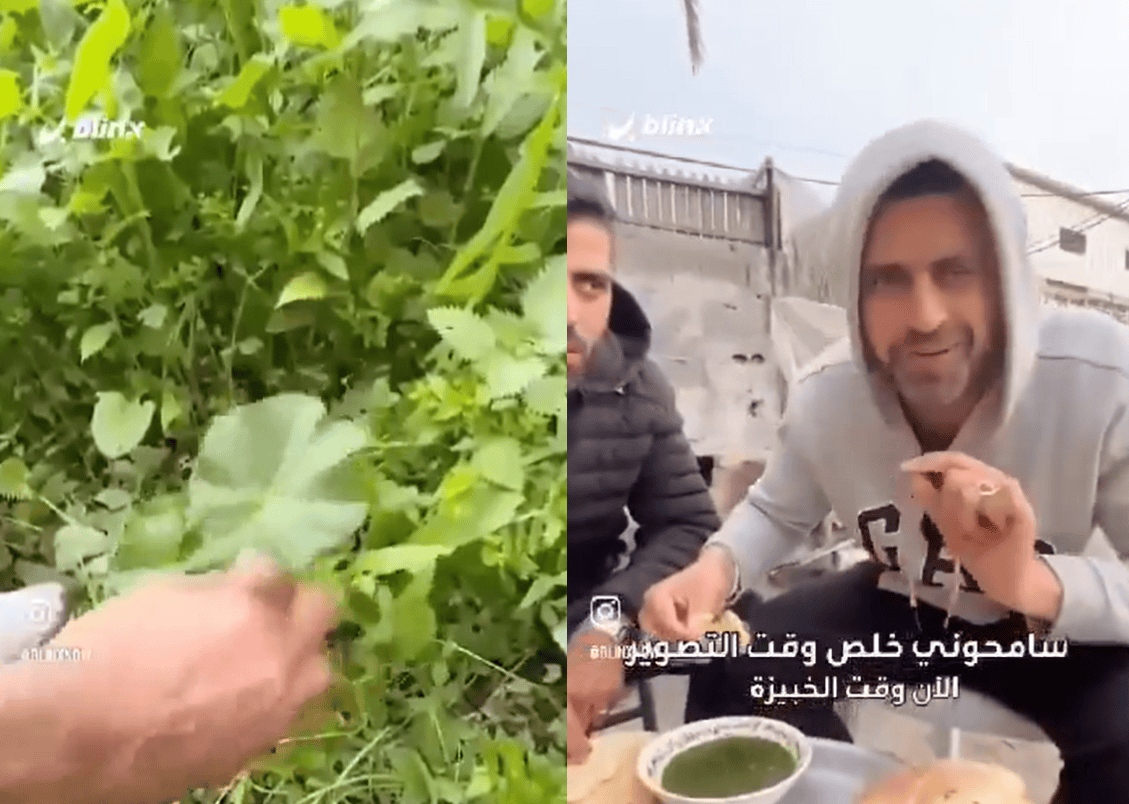 وظهر فلسطيني آخر وهو منهمك بحصد الخبيزة وتوجه للكاميرا قائلاً: “أنا كشخص لدي عائلة أكلة الخبيزة توفر علي أكلة يوم، مع العلم كم تكلف وجبة يومياً في ظل الحرب.”