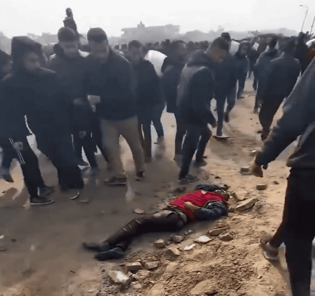 وبثت قناة “الجزيرة مباشر” مقطع فيديو مؤلم للفلسطيني الذي لم يُكشف عن اسمه وهو جثة هامدة بجانب كومة من التراب، وبدت ثيابه غارقة بالدماء فيما اجتمع حول جثته عدد من النازحين بين متألم وحزين.