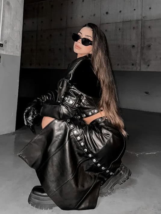 كما ظهرت ابنة نوال الزغبي في صورةٍ أخرى داخل مصعد، وترتدي معطفاً من الجلد ومن تحته “بودي” أسود اللون.