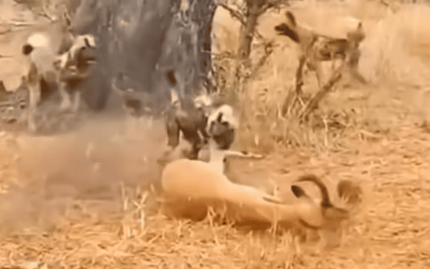 وفي بداية اللقطات المعاد تداولها في منصات التواصل ظهر الفهد وهو يمسك بالغزال الجريح لكن الكلاب البرية فاجأته بهجوم وأخذت من الفريسة ليهرب ويتسلق شجرة بالقرب من المكان.