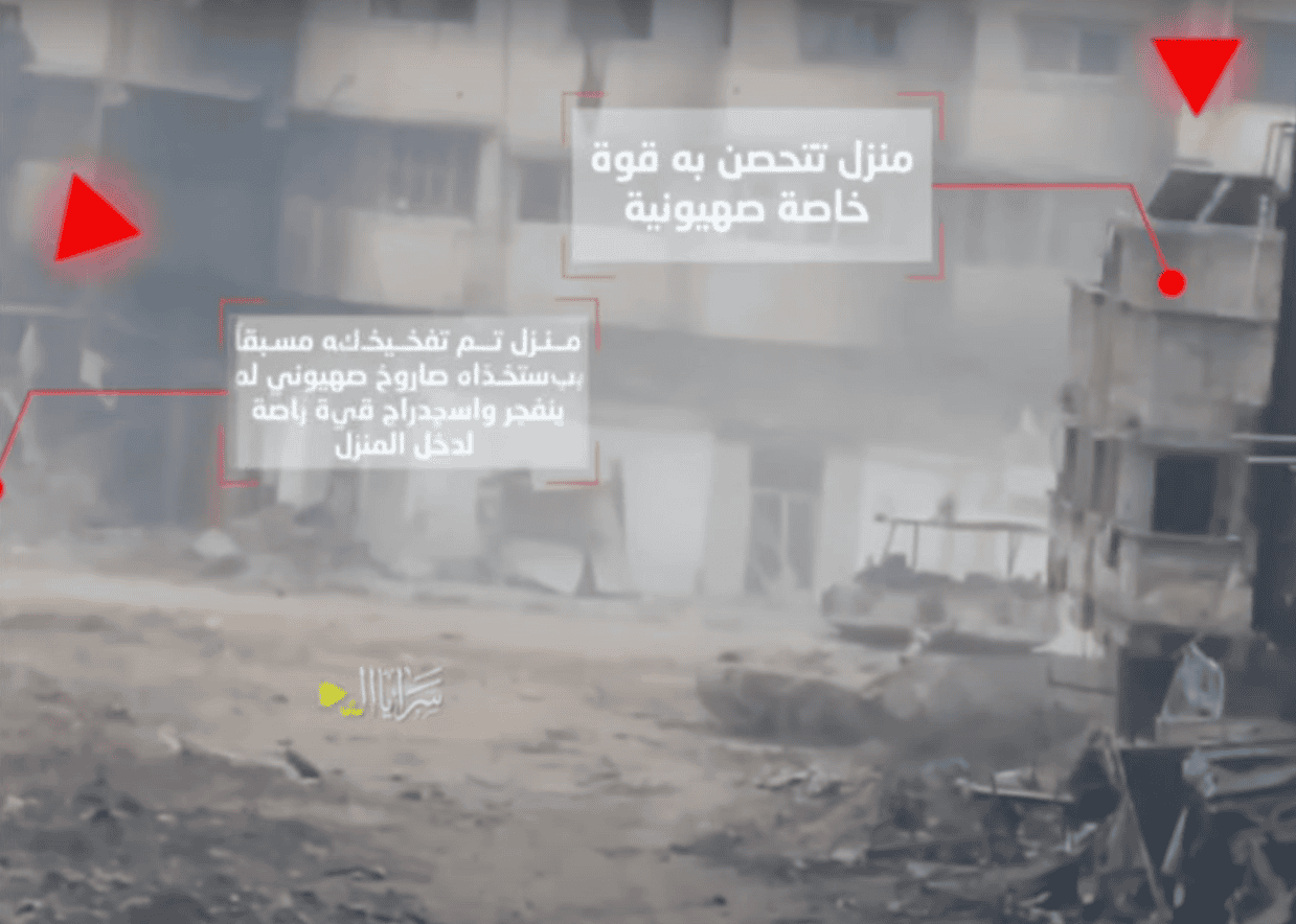 وظهر في المشاهد التي رصدتها “وطن” جندي إسرائيلي يقف وسط دمار إلى جانب دبابة متهالكة ويتم تحديده كهدف بالمثلث الأحمر المقلوب.