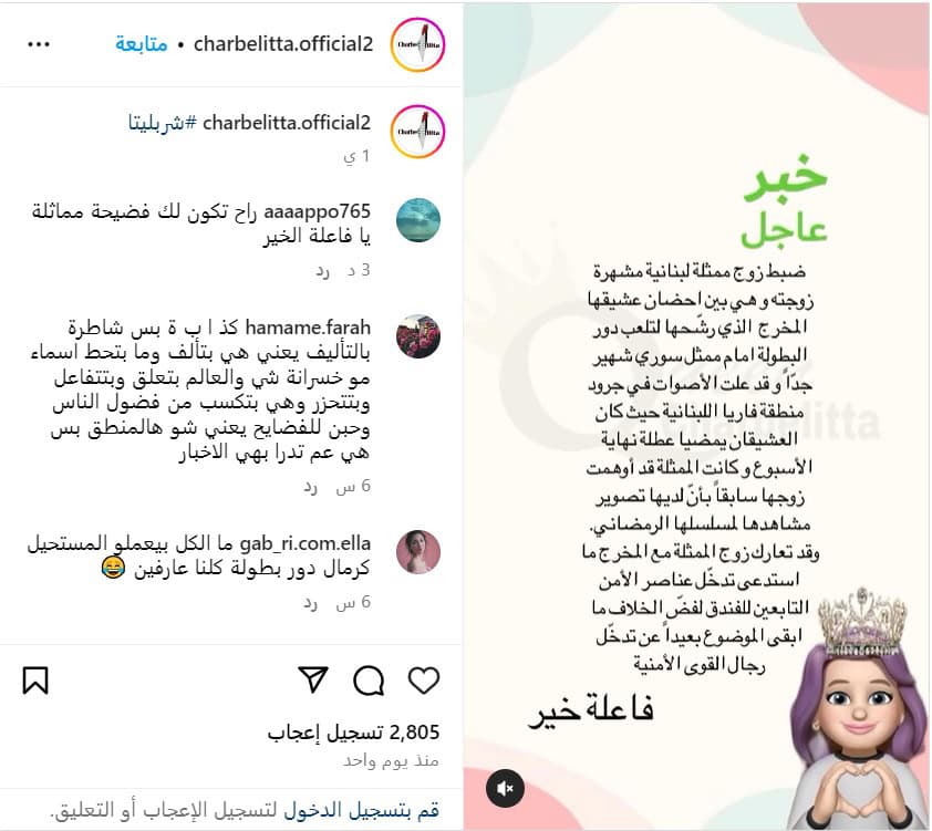 وأضافت صفحة “شربليتا” عبر حسابها الخاص على “انستغرام“: “لقد علت الأصوات في جرود منطقة فاريا اللبنانية، حيث كانا يمضيان عطلة نهاية الاسبوع، والممثلة قد أوهمت زوجها سابقًا بأن لديها تصوير مشاهد لمسلسلها الرمضاني”.