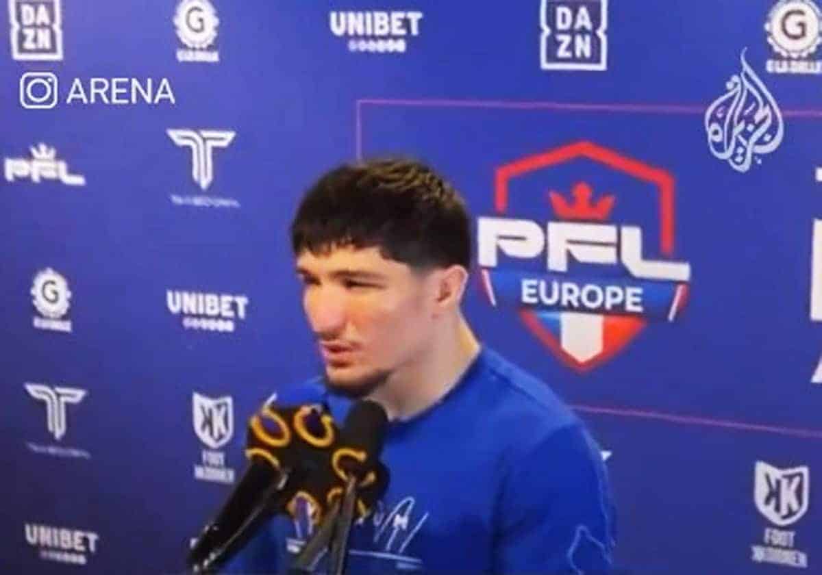 "هناك شعب يباد".. مقاتل شيشاني يتضامن مع #غزة عقب فوزه بنزال ضمن منافسات دوري المقاتلين المحترفين بباريس pic.twitter.com/VNRp0f60V4