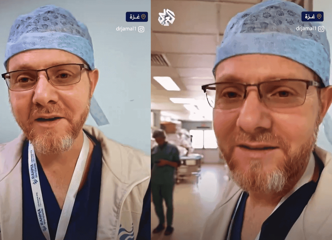 وأظهر مقطع فيديو تم تداوله على مواقع التواصل الاجتماعي الدكتور “هادي بدران” من العاصمة البريطانية لندن ـ وهو فلسطيني الأصل ـ يعمل طبيب تخدير وإنعاش في مشافي بريطانيا، وروى أنه عرف بالصدفة أن غزة بحاجة لطبيب تخدير مع مؤسسة “رحمة”.