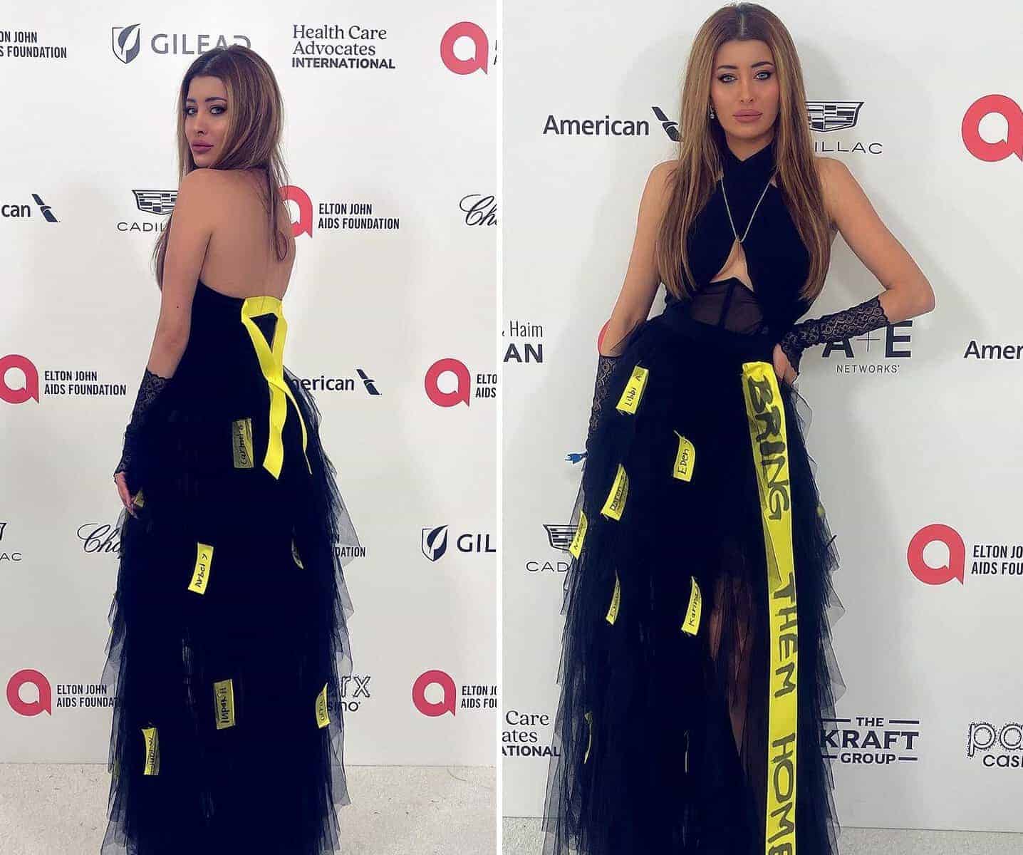 وظهرت سارة عيدان في حفل للفنان العالمي ألتون جون، وهي ترتدي فستاناً أسود يحمل أسماء 19 أسيرة إسرائيلية، بقماش من اللون الأصفر.