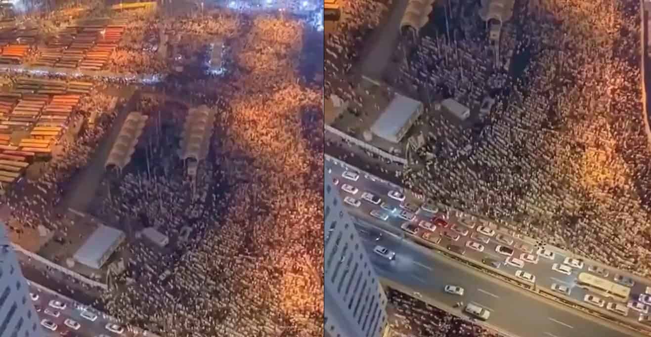 وتظهر اللقطات التي وثقت من خلال طائرة، امتداد صفوف المصلين في صلاة التراويح إلى منطقة المعلاة، والتي قال النشطاء إنها تبعد عن الحرم المكي 3.5 كم.